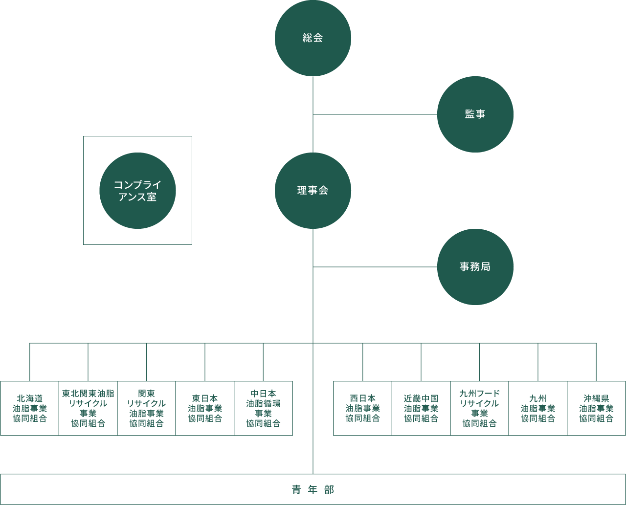 - 協同組合精神に基づいて、会員が協同して事業の振興を図り、組合員の経済的社会的地位の向上、環境を守る廃食用油リサイクル事業の推進を図ることを目的としています。